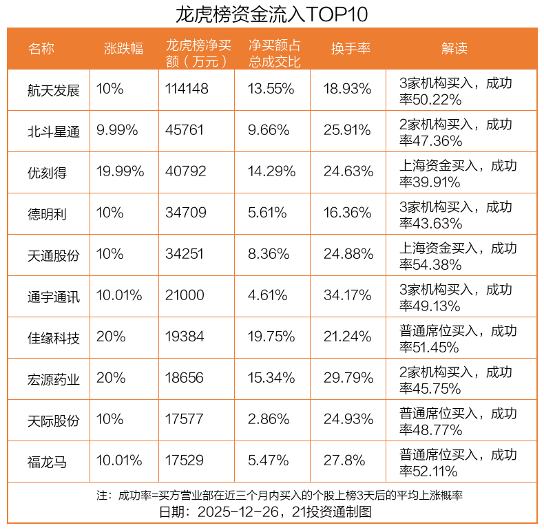 12月26日,上证指数上涨0.1%,深证成指上涨0.54%,创业板指上涨0.14%。盘后龙虎榜数据显示,共有47只个股因当日异动登上龙虎榜,资金净流入最多的是航天发展(000547.SZ),达11.41亿元。