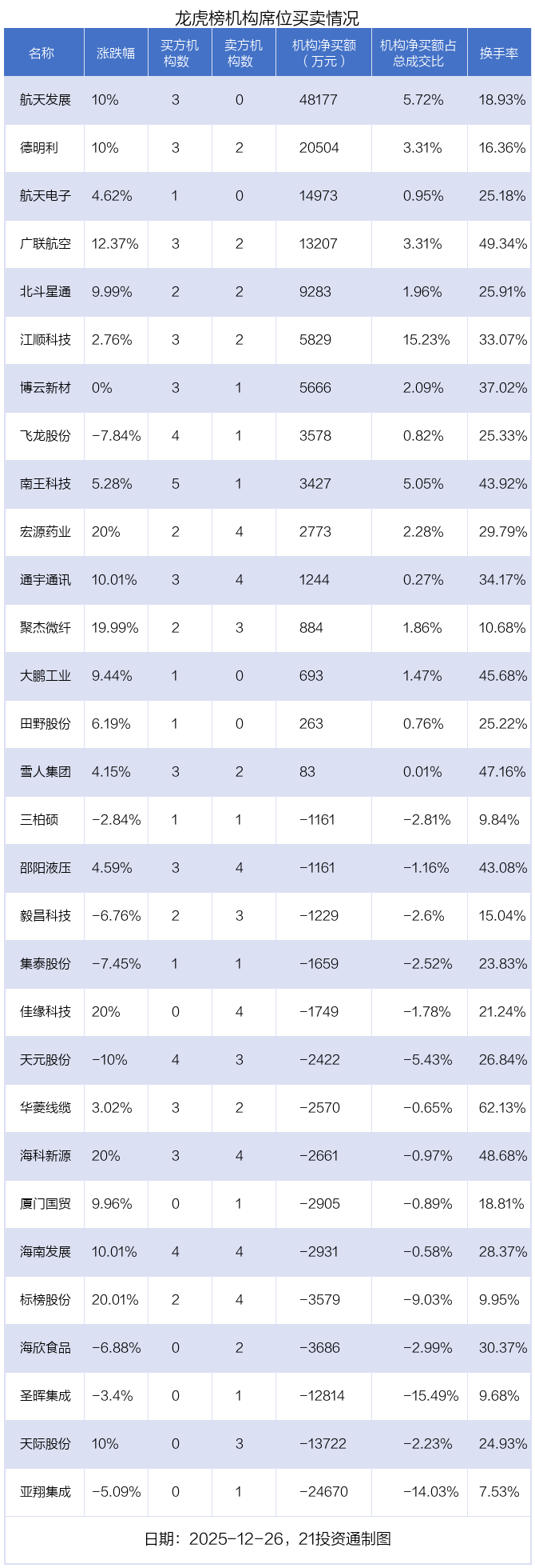 其中,机构净买入金额最多的是航天发展(000547.SZ),当日收盘上涨10%,换手率为18.93%。