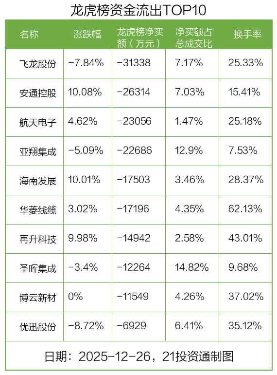而龙虎榜中资金净流出最多的是飞龙股份(002536.SZ),被净卖出为3.13亿元,占总成交金额的7.17%。飞龙股份收盘下跌7.84%,换手率为25.33%。
