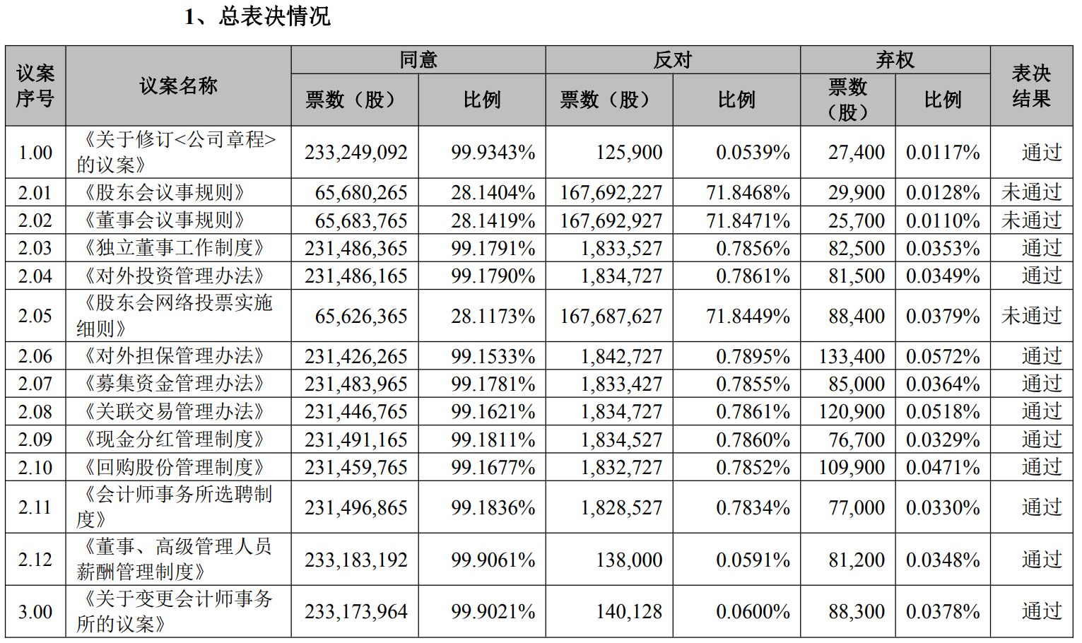 12月26日晚间公告的振芯科技2025年第一次临时股东大会决议结果显示,共有三项议案被否,分别是《股东会议事规则》《董事会议事规则》《股东会网络投票实施细则》。反对票均为1.68亿股,振芯科技控股股东国腾电子不出意外地投出了反对票。