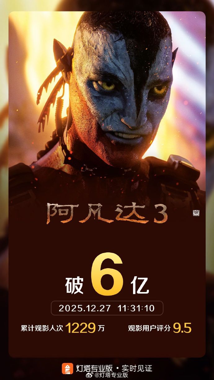 据灯塔专业版实时数据,截至12月27日11时31分,影片《阿凡达3》票房突破6亿。