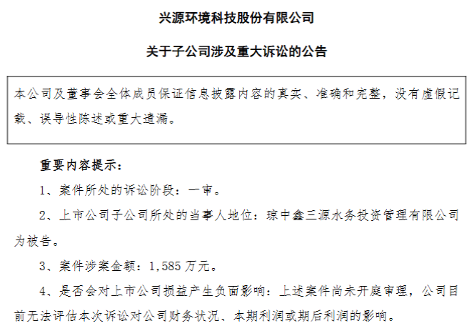 兴源环境表示,上述案件尚未开庭审理,公司目前无法评估本次诉讼对公司财务状况、本期利润或期后利润的影响。公司将按照企业会计准则规范进行相应会计处理,最终影响金额以会计师审计确认后的数据为准。