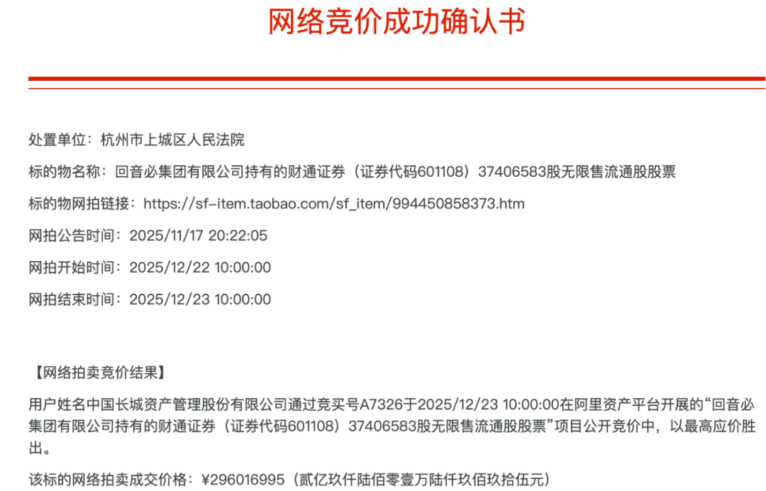 此次的拍卖标的来自杭州一家民营企业——回音必集团有限公司(简称“回音必”)。据杭州市上城区人民法院裁定,该公司被责令支付申请执行人4.26亿元及后续利息,承担申请执行费49.39万元,但始终未能履行,故拍卖其持有的财通证券37406583股股权。
