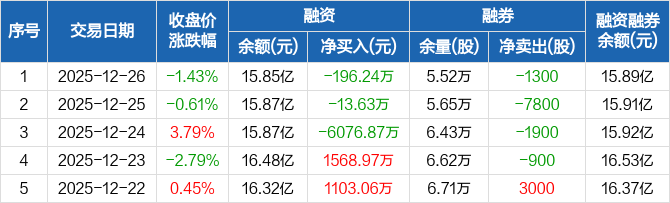 融资方面,当日融资买入6827.3万元,融资偿还7023.54万元,融资净偿还196.24万元,连续3日净偿还累计6286.74万元。融券方面,融券卖出1200股,融券偿还2500股,融券余量5.52万股,融券余额414.22万元。融资融券余额合计15.89亿元。