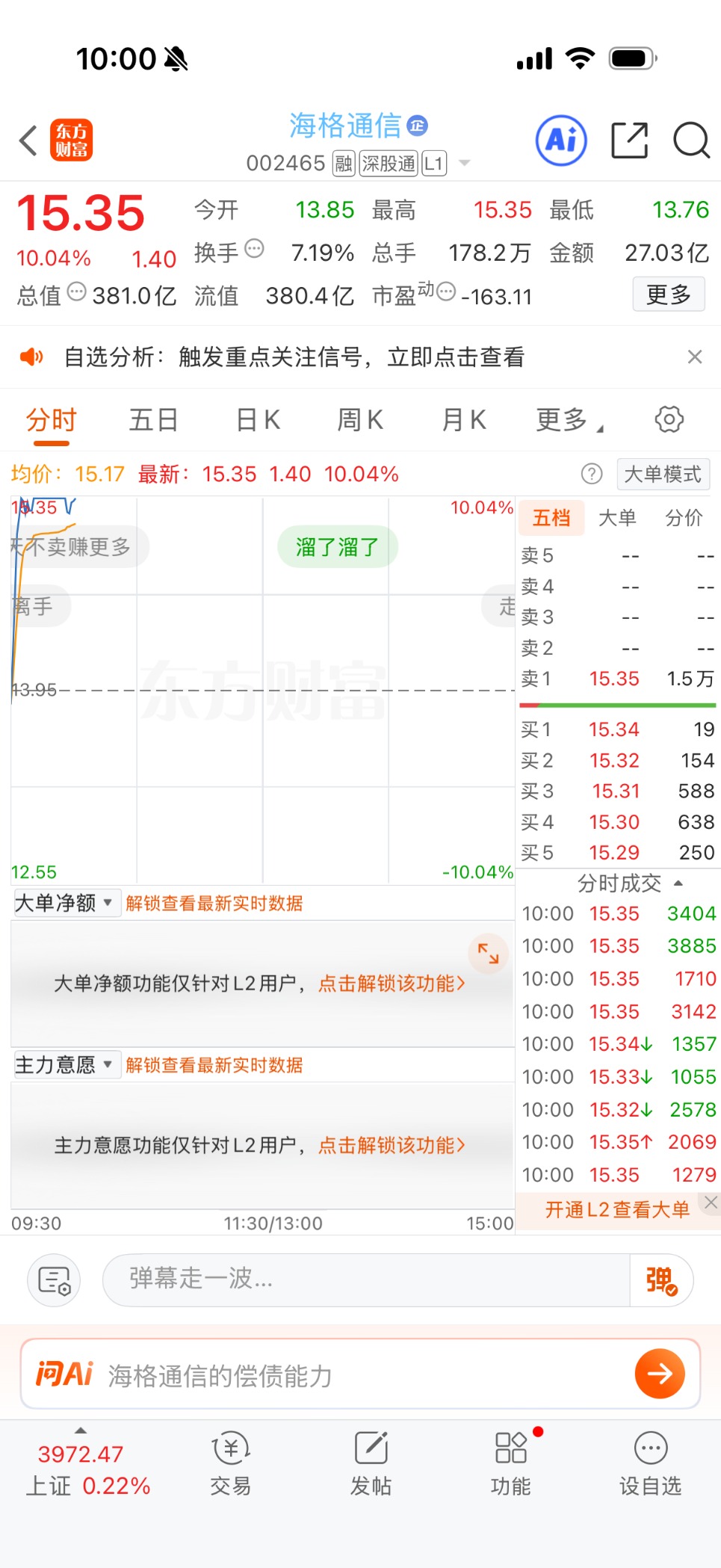 12月29日开盘后,海格通信股价直线拉升,9时41分封板涨停,股价报15.35元/股。