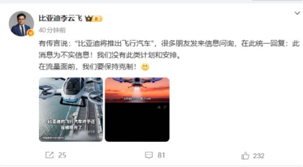 上证报中国证券网讯 12月29日,比亚迪集团品牌及公关处总经理李云飞在微博发文称,“有传言说:‘比亚迪将推出飞行汽车’,很多朋友发来信息问询,在此统一回复:此消息为不实信息!我们没有此类计划和安排。”