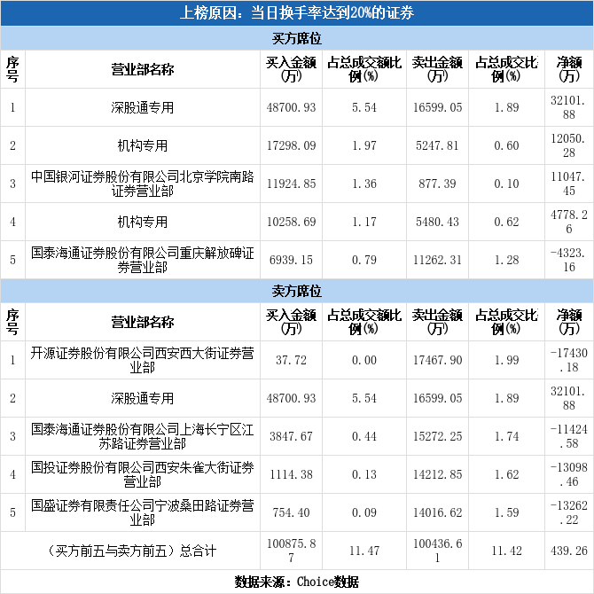 今日龙虎榜单上出现了深股通的身影,占据了买一、卖二的位置,净买入3.21亿元,占当日成交总额的3.65%。除此之外深股通还参与到了航天发展、通宇通讯、广联航空等18只个股中,其中17家呈现深股通净买入,获净买入最多的是航天发展,净买额3.87亿元;仅创元科技1家呈现深股通净卖出,净卖额为430.98万元。