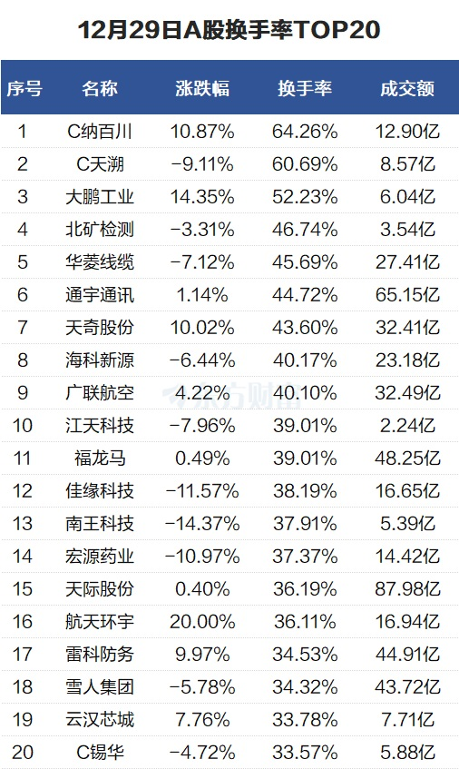 当天换手率最高的个股为C纳百川,全天换手率64.26%。C天溯紧随其后,全天换手率60.69%。