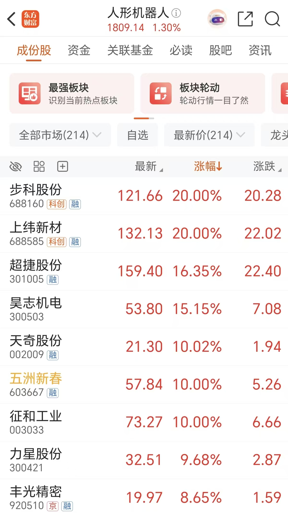 周一(12月29日)人形机器人概念拉升,锋龙股份4连板,步科股份、上纬新材20CM涨停,昊志机电、超捷股份涨超15%,五洲新春、征和工业等多股涨停。