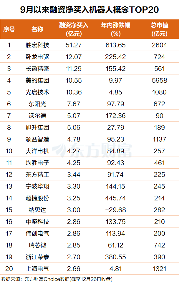 东方财富Choice数据显示,自今年9月以来,杠杆资金抢筹了一批机器人概念股,具体来看,胜宏科技排名第一,融资净买入超51亿元;卧龙电驱排名第二,融资净买入超12亿元。