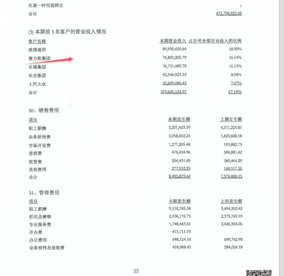 根据披露,赛力斯集团和美国通用在2023年均未进入公司前五大客户名单,而在2024年分别跃居第一和第三大客户,销售收入分别为2.26亿元和1.30亿元,占营业收入比例分别为25.52%和14.72%。