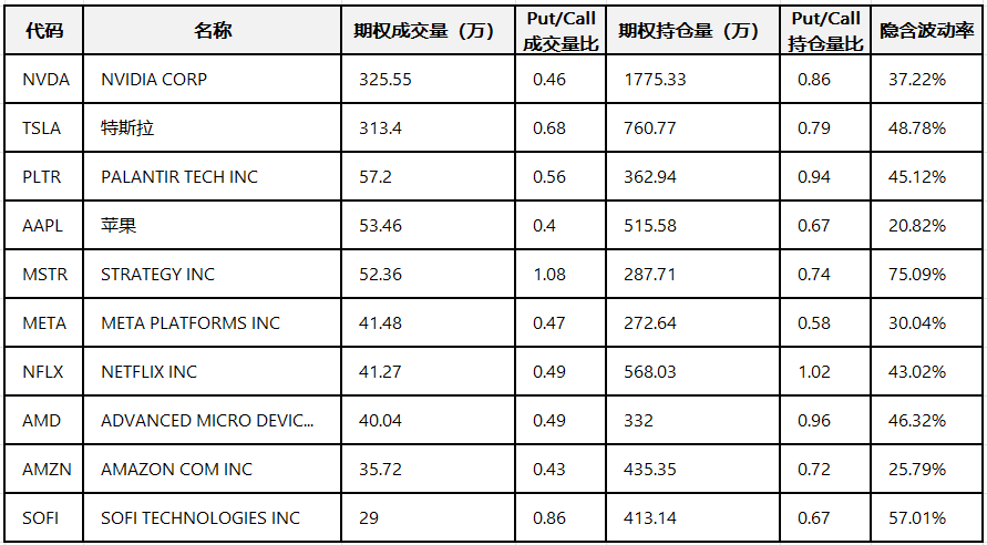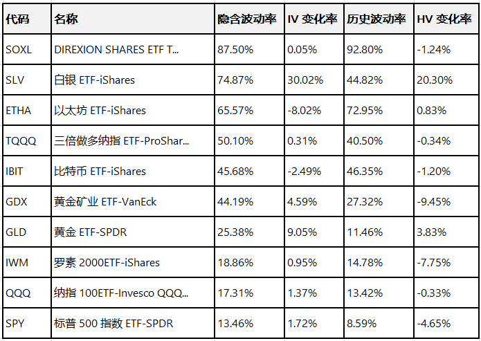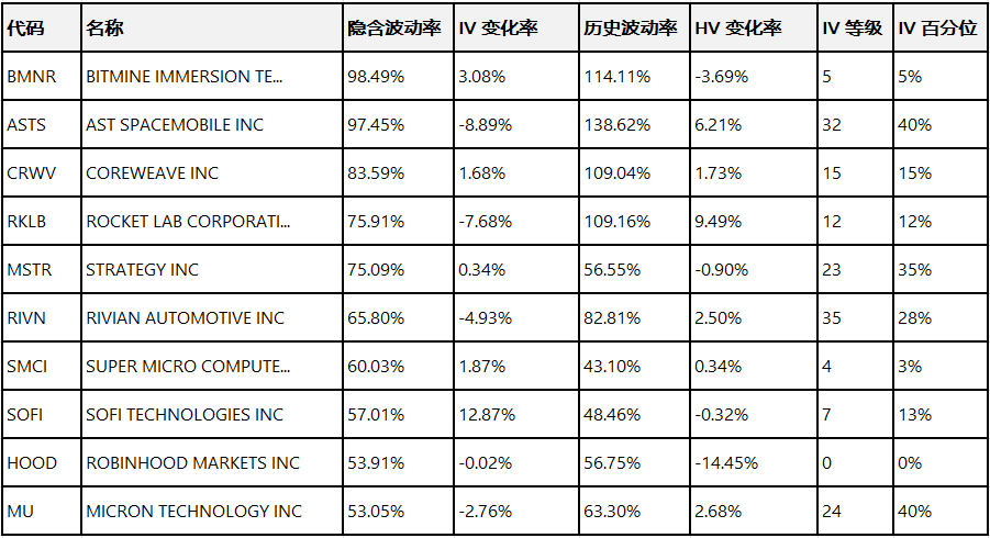 美股期权波动率排行榜前十(标的市值>100亿美元,且期权成交量>10万张)