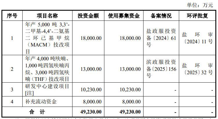 招股书显示,清泉股份IPO拟募集资金4.923亿元,将投资于公司主营业务相关的项目:年产5,000吨3,3‘-二甲基-4,4’-二氨基二环己基甲烷(MACM)技改项目、年产4,000吨呋喃、1,000 吨四氢呋喃丙烷、3,000 吨四氢呋喃(THF)技改项目、研发中心建设项目、补充流动资金。
