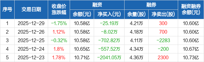 融资方面,当日融资买入3862.3万元,融资偿还3887.49万元,融资净偿还25.19万元,连续5日净偿还累计3334.6万元。融券方面,融券卖出1000股,融券偿还700股,融券余量4.21万股,融券余额198.4万元。融资融券余额合计10.6亿元。