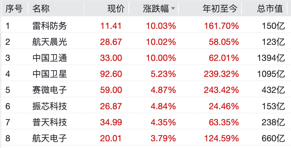 另外,雷科防务录得10cm涨停,航天电子、航天发展、中天火箭、中航重机等涨幅居前。