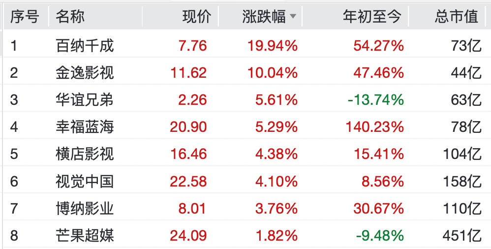 个股方面,百纳千成录得20cm涨停,金逸影视涨停。华谊兄弟、幸福蓝海、横店影视、博纳影业等纷纷上涨。