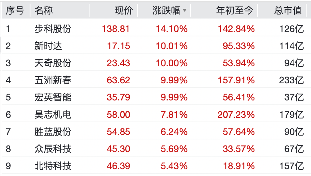 今天上午,人形机器人概念股延续上涨行情。五洲新春录得2连板,续创历史新高;天奇股份、宏英智能、新时达录得10cm涨停,步科股份涨超14%,众辰科技、昊志机电、北特科技、胜蓝股份等跟涨。