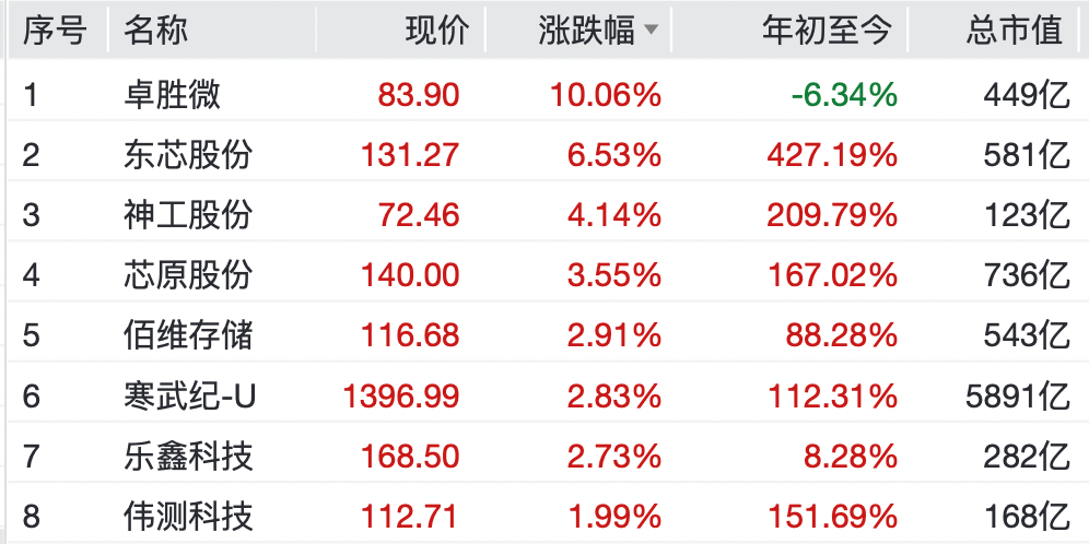 个股方面,卓胜微涨超10%,东芯股份涨超6%,芯原股份、中芯国际、寒武纪-U、海光信息、北方华创纷纷上涨。