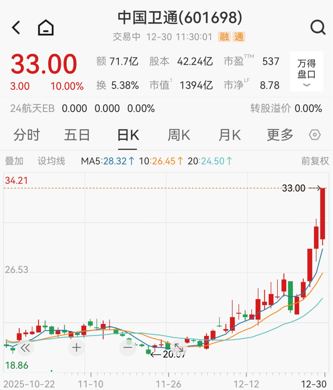 中国卫通录得10cm涨停,股价同样续创新高。