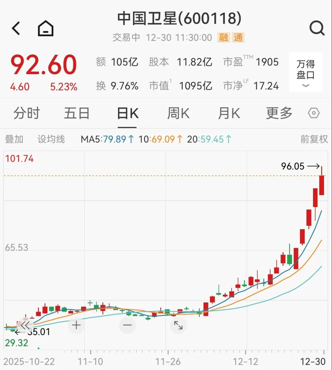上午,航天军工板块领涨,商业航天概念股持续活跃。中国卫星涨超5%,续创历史新高。