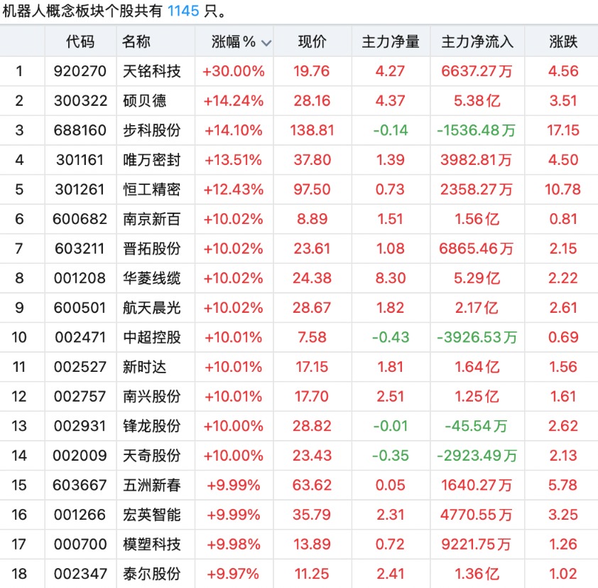截至上午收盘,天铭科技(920270)(“30cm”涨停)、南京新百(600682)、晋拓股份(603211)、华菱线缆(001208)、航天晨光(600501)、中超控股(002471)、新时达(002527)、南兴股份(002757)、锋龙股份(002931)、天奇股份(002009)、五洲新春(603667)、宏英智能(001266)、模塑科技(000700)、泰尔股份(002347)等14只机器人概念股涨停。其中,锋龙股份达成5连板,天奇股份、泰尔股份4连板。