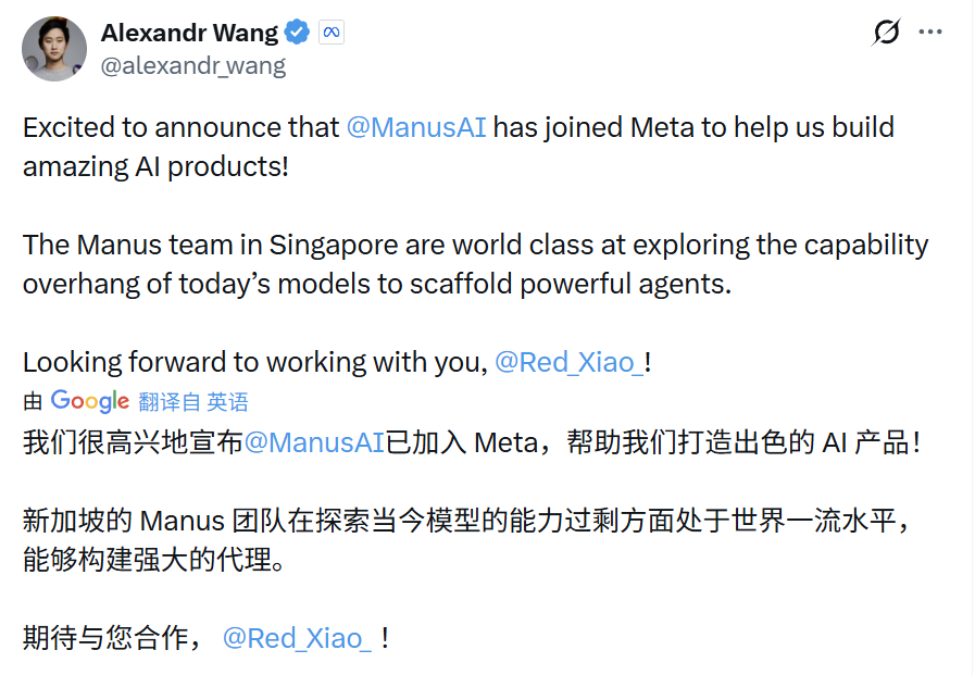 消息公布后,Alexandr Wang在X上发文欢迎Manus团队加入Meta。
