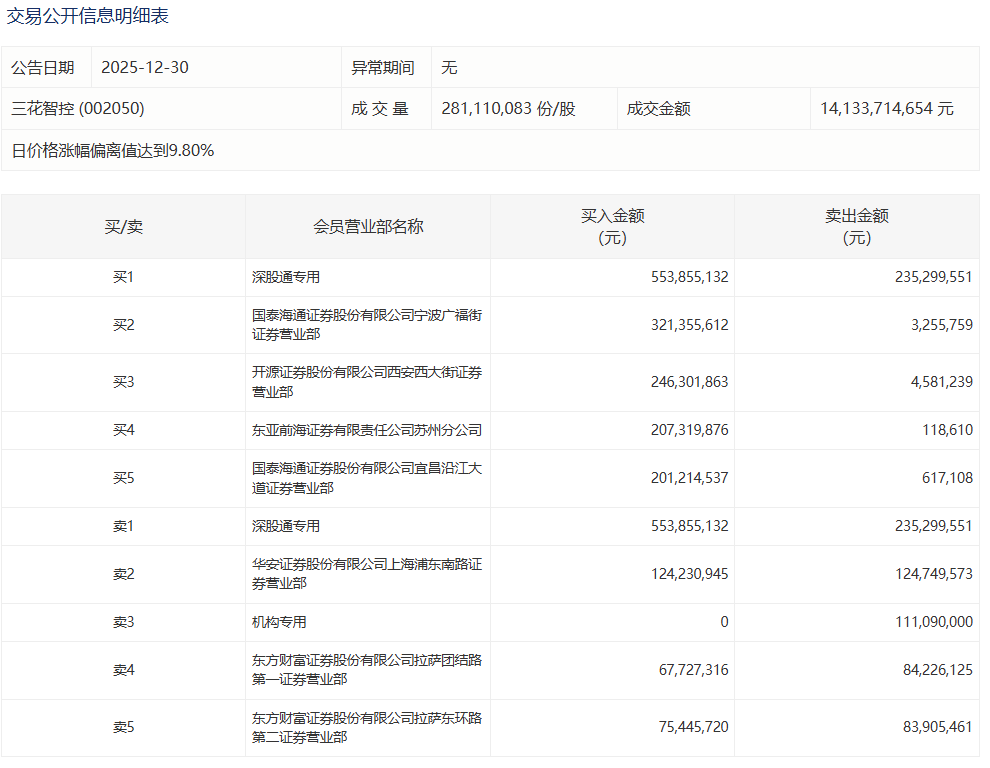 三花智控今日涨停,成交额141.34亿元,换手率7.63%。盘后龙虎榜数据显示,深股通专用席位买入5.54亿元并卖出2.35亿元,有1家机构专用席位净卖出1.11亿元。