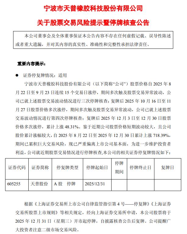 天普股份12月30日公告,公司股票价格自2025年8月22日至9月23日连续15个交易日涨停,期间多次触及股票交易异常波动,公司已就上述股票交易波动情况进行三次停牌核查;复牌后2025年10月16日至11月27日股票价格多次涨停,期间多次触及股票交易异常波动,公司已就上述股票交易波动情况进行第四次停牌核查;复牌后2025年12月3日至12月30日股票价格多次涨停,累计上涨48.31%。鉴于近期公司股票价格短期波动较大,且公司股价累计涨幅较大,自2025年8月22日至2025年12月30日累计上涨718.39%,期间已累积巨大交易风险,现已严重偏离上市公司基本面,为进一步维护投资者利益,公司就近期股票交易情况进行停牌核查。经向上海证券交易所申请,公司股票将于2025年12月31日(星期三)开市起停牌。