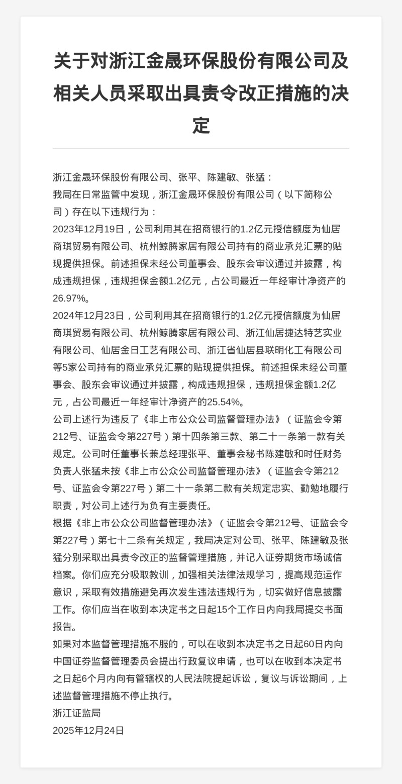 对此,浙江证监局决定对浙江金晟环保股份有限公司、张平、陈建敏及张猛分别采取出具责令改正的监督管理措施,并记入证券期货市场诚信档案。