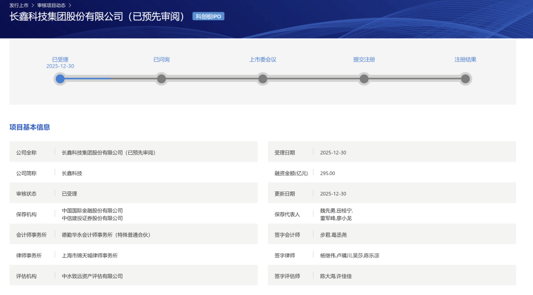 2025年12月30日,上交所官网显示,长鑫科技集团股份有限公司(简称:长鑫科技)科创板IPO申请获受理,保荐机构为中国国际金融股份有限公司、中信建投证券股份有限公司,审计机构为德勤华永会计师事务所(特殊普通合伙),律师事务所为上海市锦天城律师事务所。