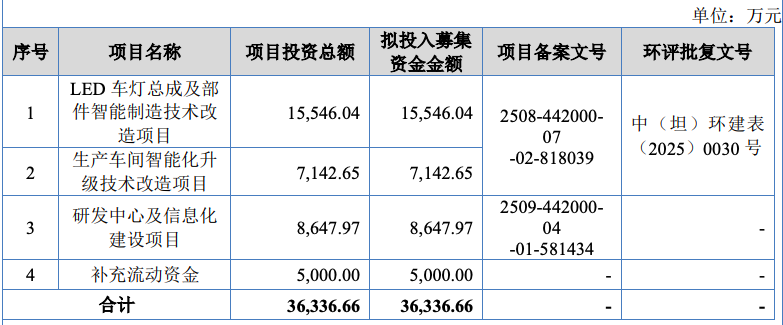 易事达此次IPO拟募资3.63亿元,将用于LED车灯总成及部件智能制造技术改造项目、生产车间智能化升级技术改造项目、研发中心及信息化建设项目,以及补充流动资金。