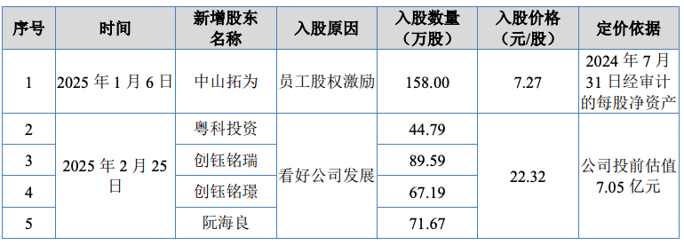 读创财经梳理招股书注意到,2025年1月和2月,公司通过增资引入了员工持股平台中山拓为和粤科投资、创钰铭璟、创钰铭瑞和阮海良等5名新股东。其中,员工股权激励价格为7.27元/股,而外部投资者入股价格为22.32元/股,定价差异悬殊,其定价依据的合理性受到质疑。