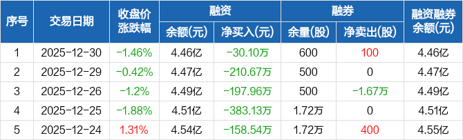 融资方面,当日融资买入1350.05万元,融资偿还1380.14万元,融资净偿还30.1万元,连续5日净偿还累计980.39万元。融券方面,融券卖出100股,融券偿还0股,融券余量600股,融券余额9732元。融资融券余额合计4.46亿元。