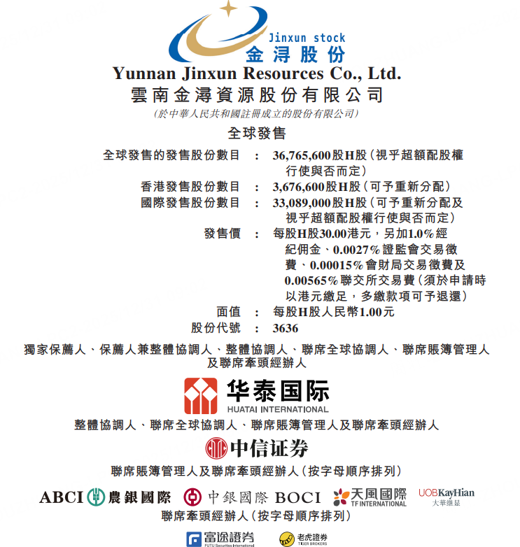 12月31日, 金浔资源于12月31日至1月6日招股,公司拟全球发售3676.56万股H股,其中,香港发售占10%,国际发售占90%,另有超额配股权15%。每股发售价30港元,每手200股,预期将于1月9日在联交所开始买卖。