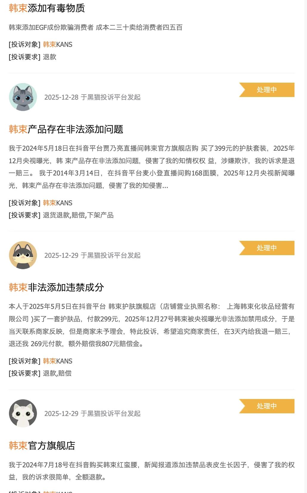 《国际金融报》记者注意到,黑猫投诉平台,不少消费者密集要求退货退款,表示产品现被曝光含有非法添加物,不敢再用,有人直言“(韩束产品)有送A检测,生产B货售卖的嫌疑,现剩余的东西都不敢使用,成本26元,报价299(元)”。