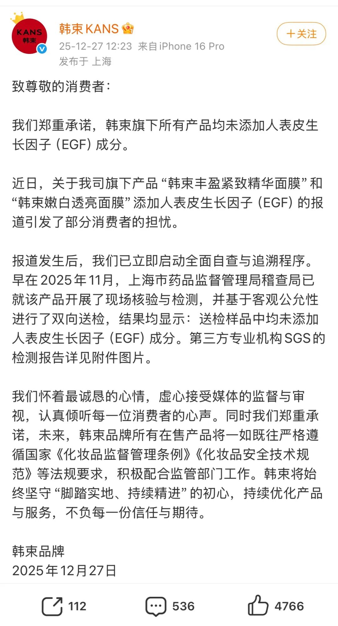 其还表示,报道发生后,韩束已立即启动全面自查与追溯程序。2025年11月,上海市药品监督管理局稽查局已就该产品开展了现场核验与检测,并基于客观公允性进行了双向送检,结果均显示:送检样品中均未添加人表皮生长因子(EGF)成分。