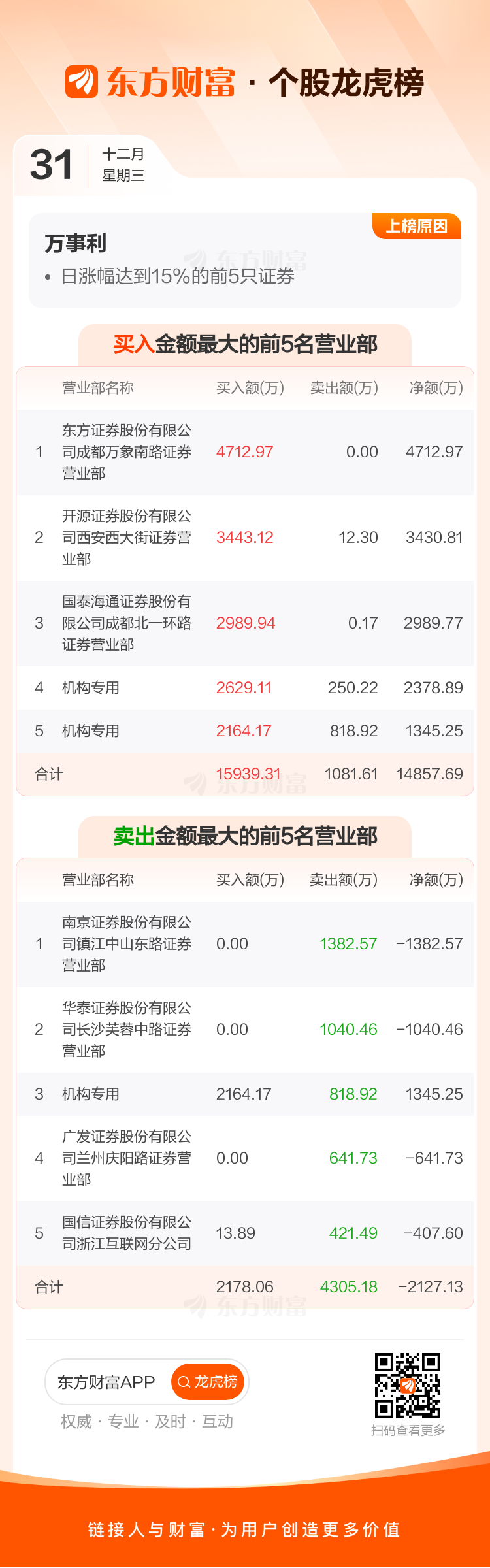 交易所2025年12月31日公布的交易公开信息显示,万事利因成为日涨幅达到15%的前5只证券上榜。万事利当日收报19.69元,涨跌幅19.99%,偏离值20.00%,换手率13.65%,成交额4.78亿。