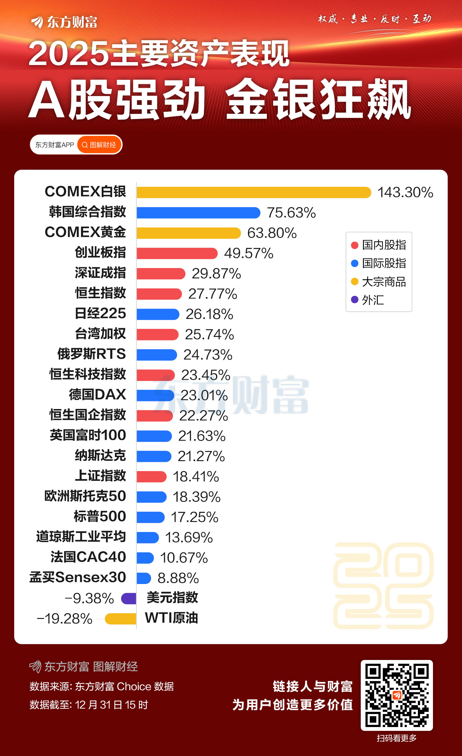A股2025年交易收官。12月31日,上证指数小幅收涨,日K线报11连阳,追平2018年初以来最长连阳纪录。回顾全年,上证指数涨18.41%,为2019年以来最大年度涨幅;深证成指涨29.87%,创业板指涨49.57%,均创2020年以来最佳年度表现。个股方面,今年有600余只股票股价翻倍,超过A股数量的10%。