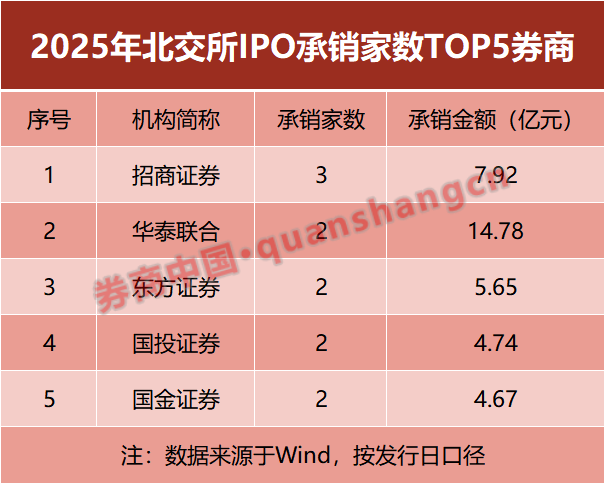 与此同时,北交所持续深化服务创新型中小企业的核心定位,2025年亦新增26家企业上市。从承销项目数量来看,前五券商依次为招商证券、华泰联合、东方证券、国投证券、国金证券。