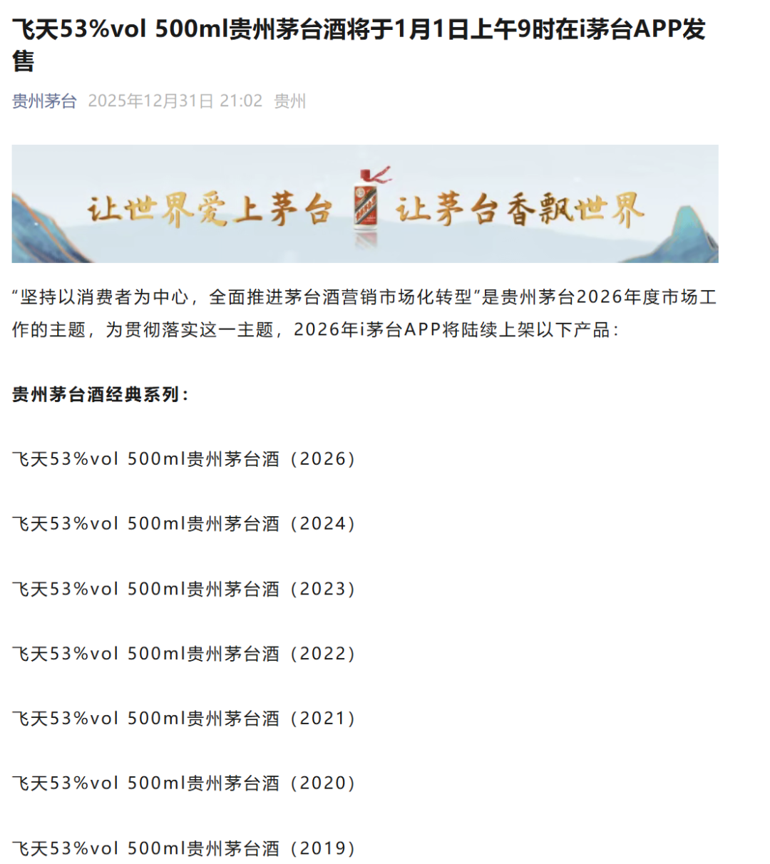 2026年的第一天,上午9时起,每人每日可在i茅台购买12瓶飞天茅台酒!