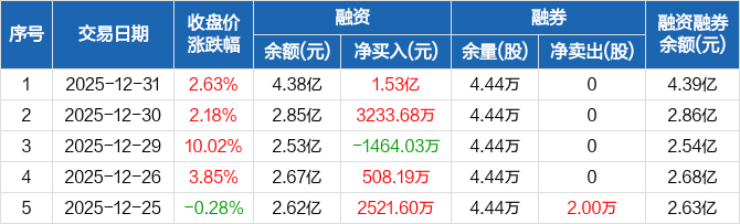 融资方面,当日融资买入3.44亿元,融资偿还1.91亿元,融资净买入1.53亿元,净买入额创历史新高。融券方面,融券卖出0股,融券偿还0股,融券余量4.44万股,融券余额74.64万元。融资融券余额合计4.39亿元。