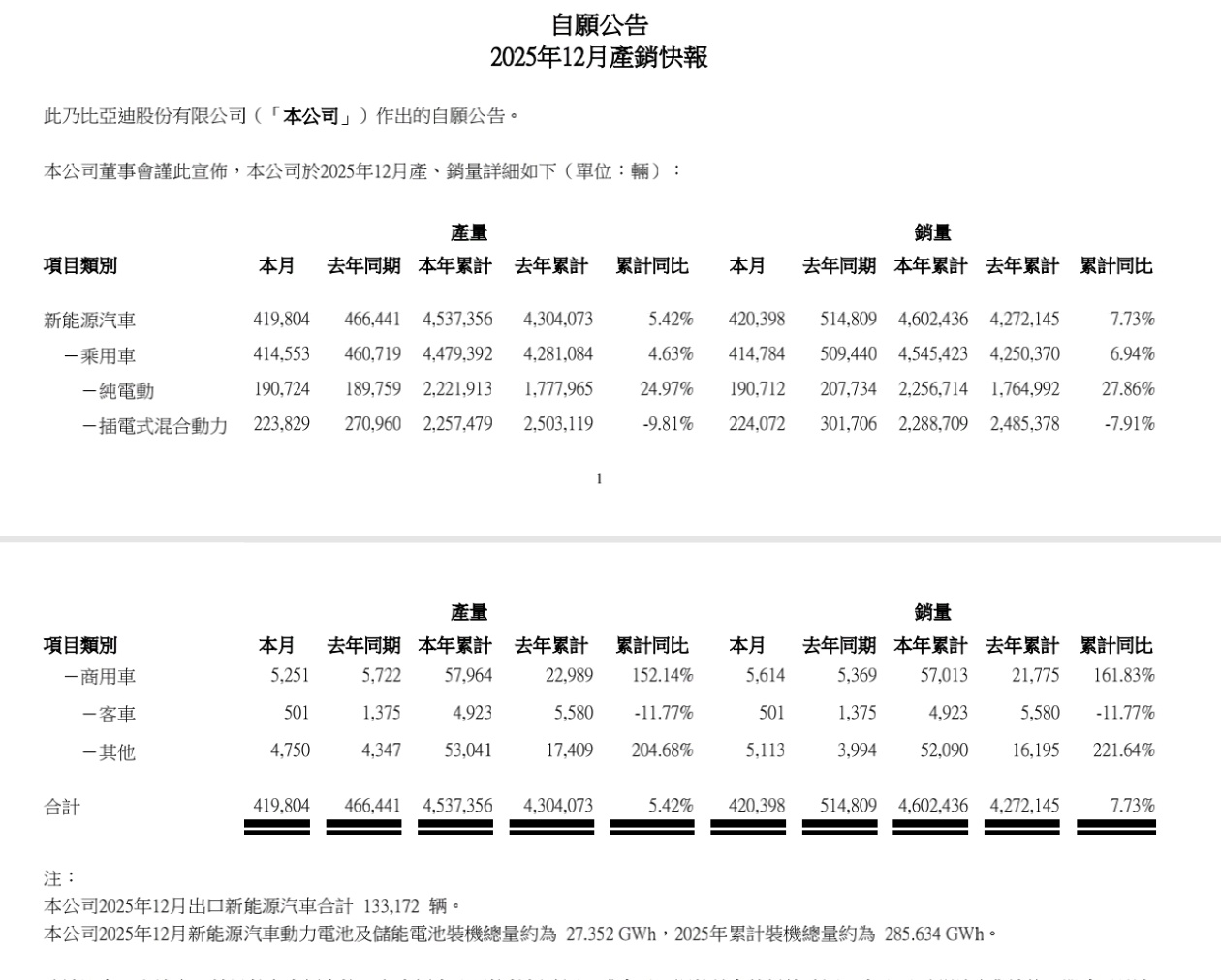 上证报中国证券网讯(记者黎灵希)2026年1月1日晚间,比亚迪股份在港交所公告,2025年12月新能源汽车销量约42.04万辆,同比下滑约18%;2025年累计销量约460.24万辆,累计同比增7.73%。