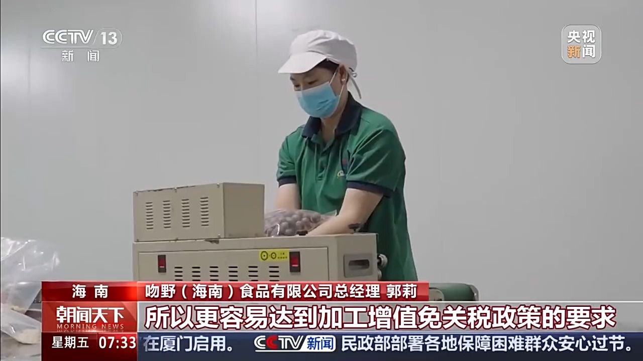 吻野(海南)食品有限公司总经理郭莉:比如夏威夷果,原来我们必须要卖到143元/斤才能享受免税。封关之后,使用岛内的盐,我们只需要卖130元/斤以上,所以更容易达到加工增值免关税政策的要求。