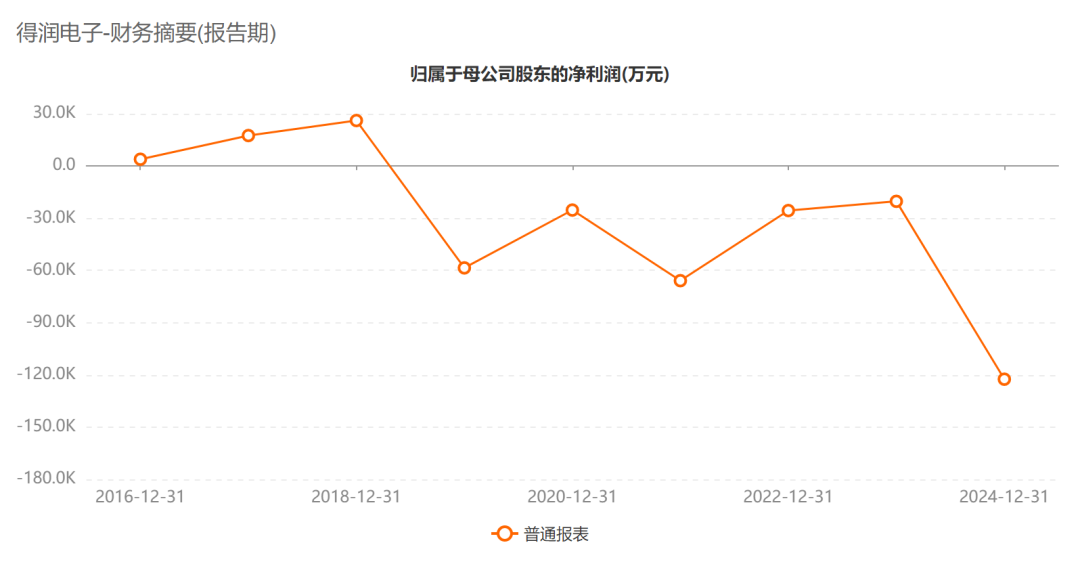 近年来,得润电子的主营业务表现疲弱。根据2024年年报,公司全年归母净利润亏损12.25亿元,同比下滑超过500%。亏损大幅扩大的一个重要原因,是公司失去了对重要子公司意大利Meta的控制权,导致其不再纳入合并报表,并计提了大额资产减值。据统计,自2019年至2024年,公司已连续6年净利润为负,累计亏损总额近32亿元。
