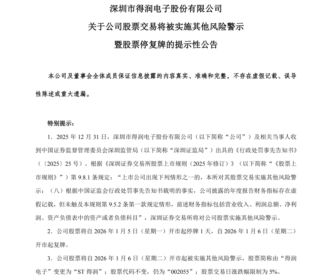 根据公告,深交所将对公司股票实施其他风险警示,股票简称由“得润电子”变更为“ST得润”;股票代码不变,仍为“002055”;股票交易日涨跌幅限制为5%。公司股票将自2026年1月5日(星期一)开市起停牌1天,自2026年1月6日(星期二)开市起复牌。