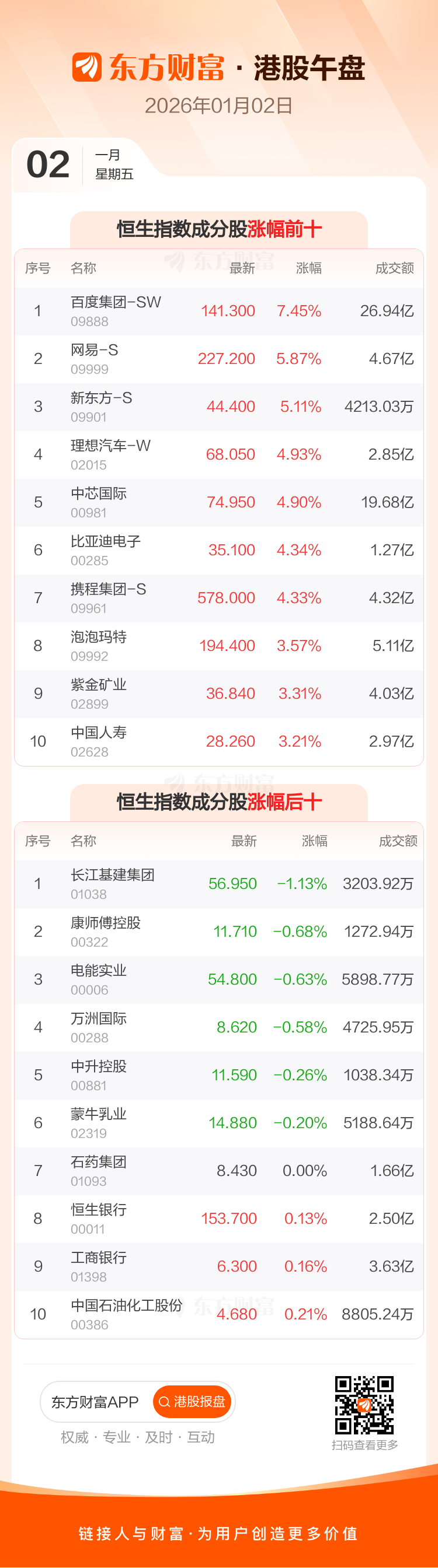 港股1月2日午盘走高,恒生指数收报26189.79点,涨559.25点,涨幅2.18%;恒生科技指数收报5702.56点,涨186.58点,涨幅3.38%。恒生指数成分股中百度集团-SW、网易-S、新东方-S涨幅居前,长江基建集团、康师傅控股、电能实业跌幅靠前。恒生科技指数成分股中华虹半导体、百度集团-SW、金蝶国际涨幅居前。