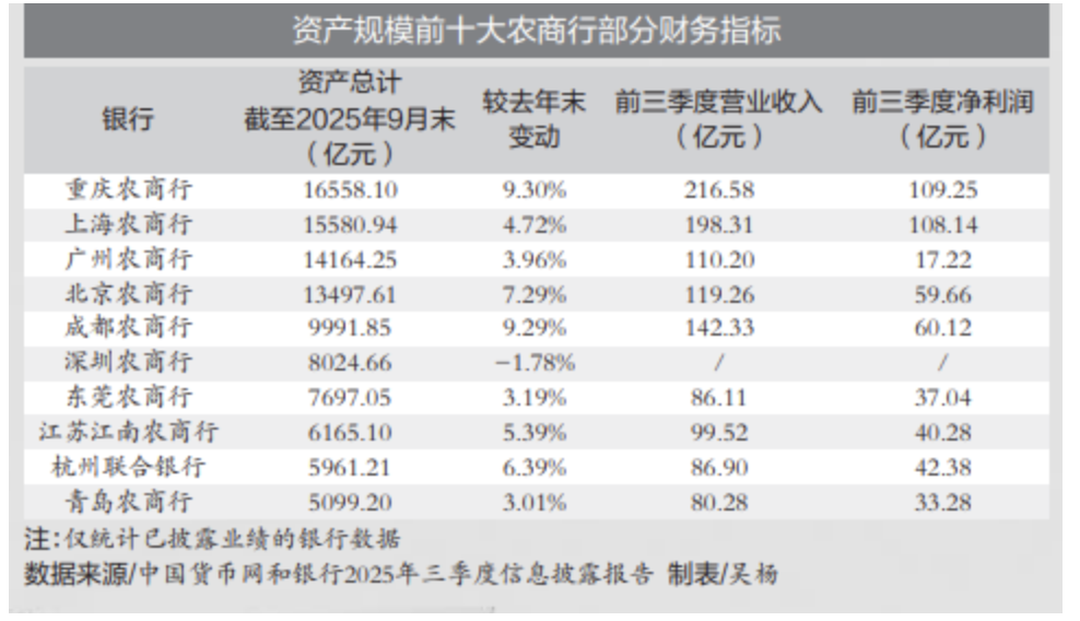 根据统计,2025年三季度时,重庆农商行、上海农商行、广州农商行、北京农商行以合计超5.9万亿元的资产规模稳居“资产万亿俱乐部”。
