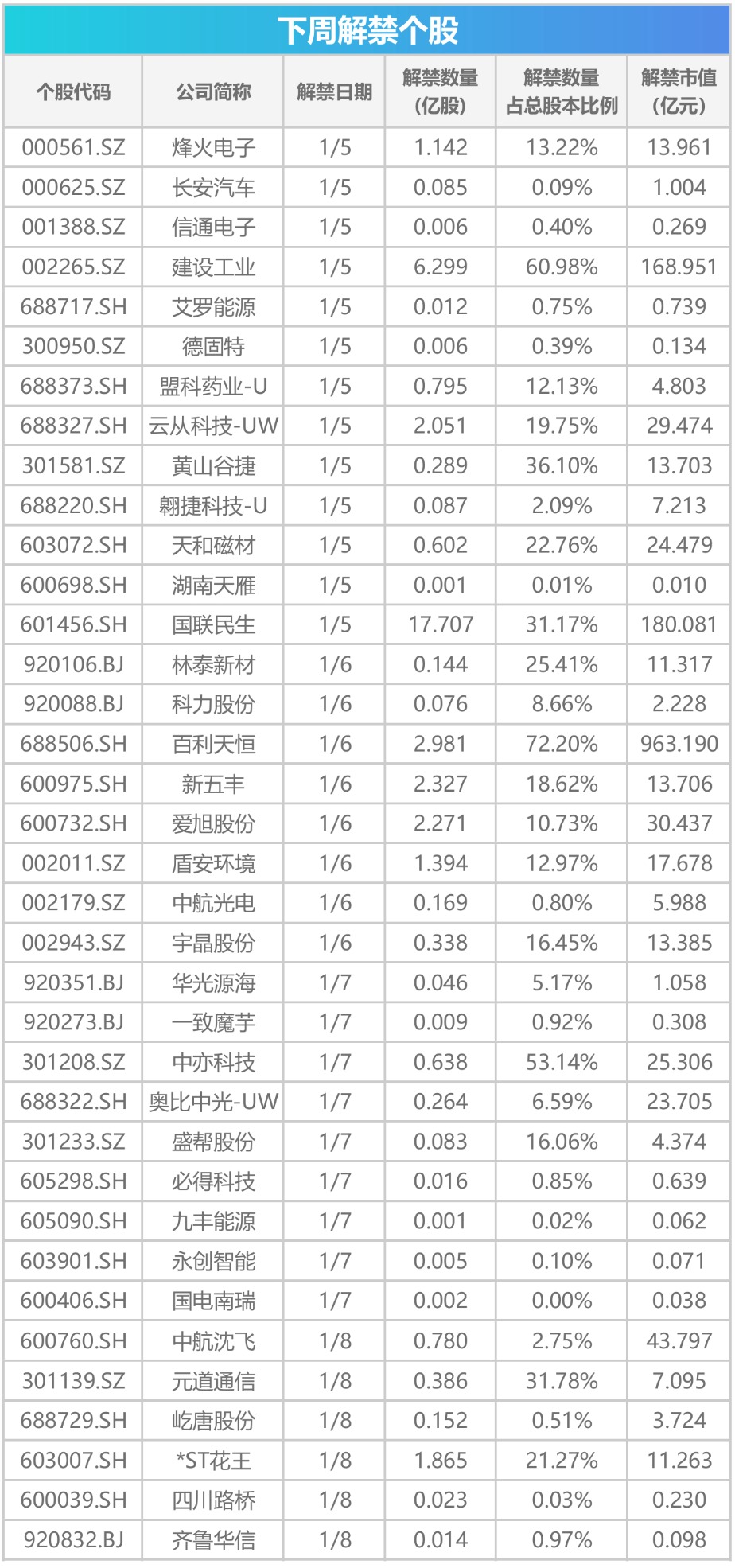 Wind数据统计显示,下周(1月5日至1月9日)共有36只限售股解禁,按最新收盘价计算,解禁总市值超1600亿元。