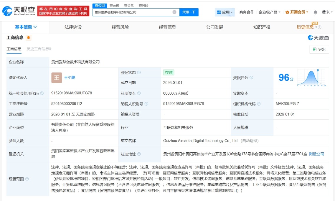南方财经1月4日电,天眼查工商信息显示,近日,贵州爱茅台数字科技有限公司成立,法定代表人为王小鹏,注册资本6亿人民币,经营范围包括互联网信息服务、互联网新闻信息服务、互联网直播技术服务、网络文化经营等。股东信息显示,该公司由贵州茅台(600519)全资持股。