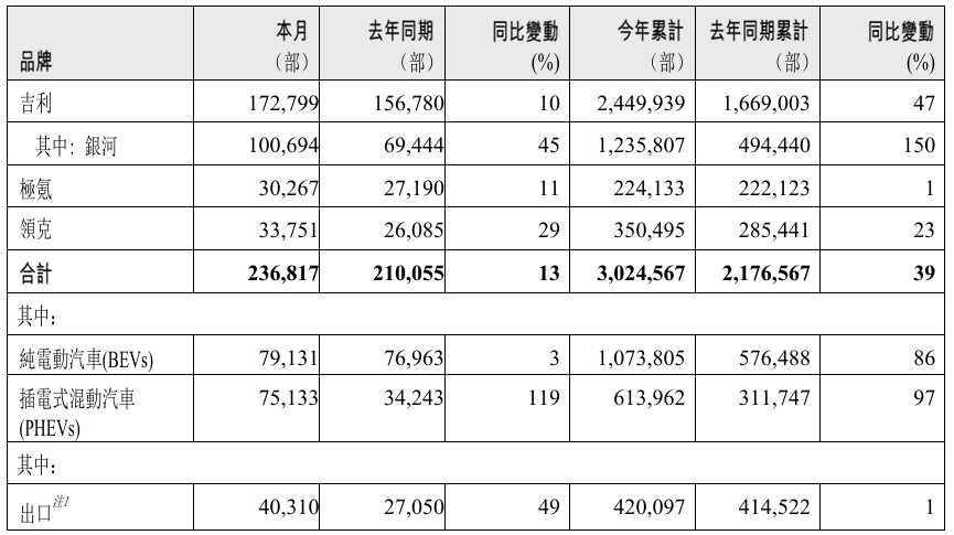 1月1日,吉利汽车(00175/80175)发布公告,本集团于2025年12月的汽车总销量为23.68万部,较去年同期增长约13%;2025年全年汽车总销量为302.46万部,较去年同期增长约39%,并超额完成全年销量目标(300万部)。具体情况如下: